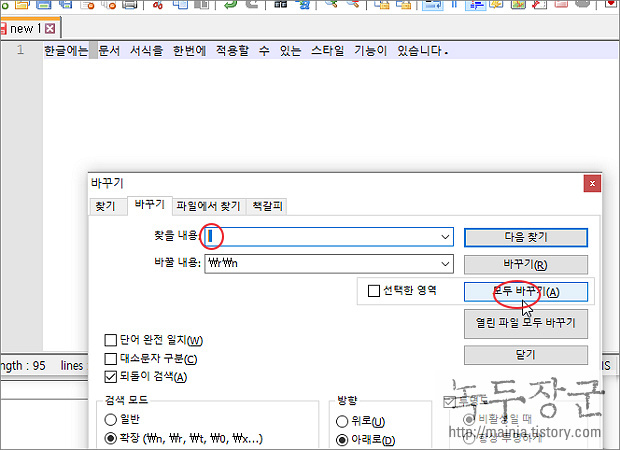 ▼ 줄바꿈문자를 문자를 제거하고 싶다면 바꾸기 창을 띄웁니다. Ctrl + h 단축키를 이용합니다.