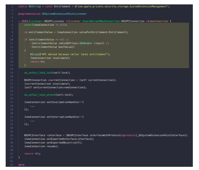 With the release of macOS 10.15.1, Apple has patched this vulnerability. If we disassemble and reconstruct the code for [OSSystemExtensionPointListener listener:shouldAcceptNewConnection:] we can see the changes that they applied: