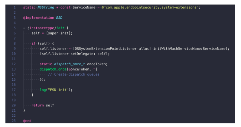 The privilege escalation vulnerability actually exists within endpointsecurityd and the SystemExtensions.framework it depends on. All of the communication above, between daemons, takes place using a low level system IPC mechanism called XPC. The SystemExtensions.framework provides a OSSystemExtensionPointListener class used by endpointsecurityd to listen for the XPC activation requests sysextd sends. When the endpointsecurityd daemon starts up it does the following: