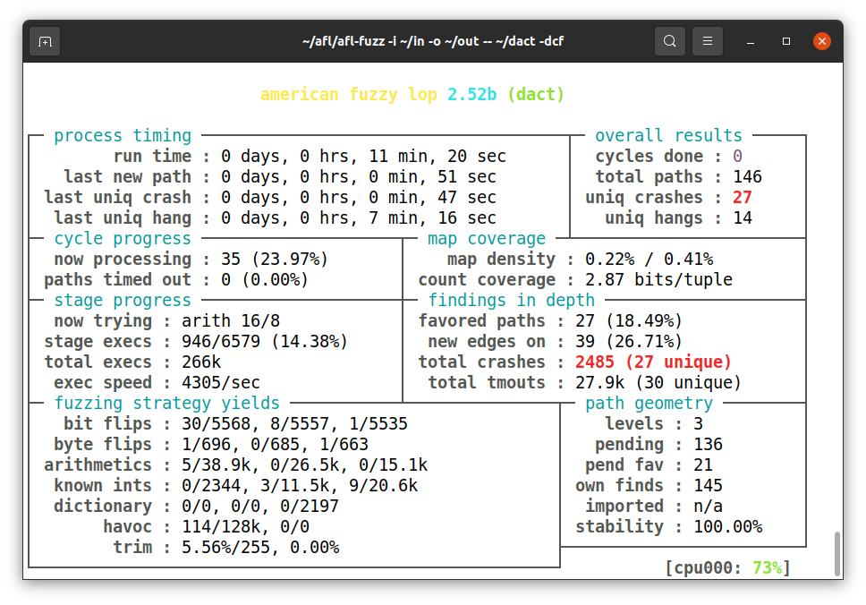 AFL을 이용해 dact 바이너리를 퍼징하고 crash를 생성했다.
