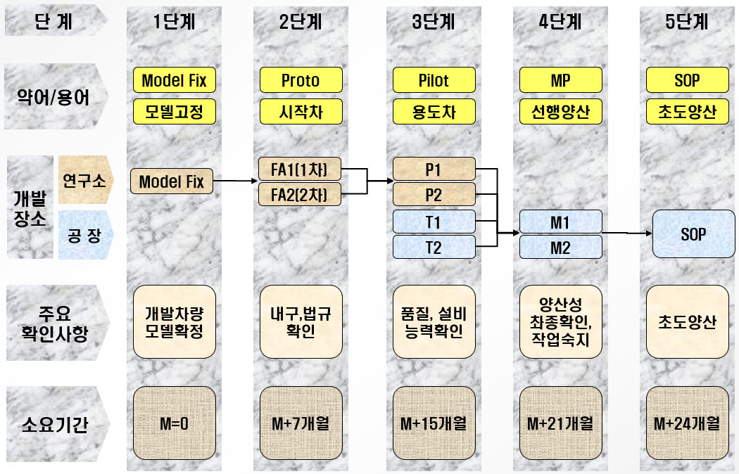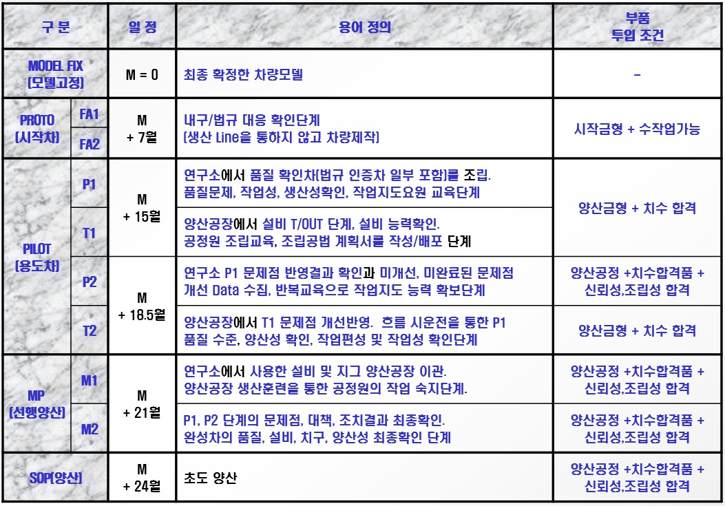 사실 이렇게 디테일하게 알 필요는 없겠으나 관련 업종에 있는 분은 알 필요가 있는 내용입니다. P1이 마무리가 되었네, 초도양산 시점이 언제네 등 용어를 알아야 대화를 하기에..... 자동차 신