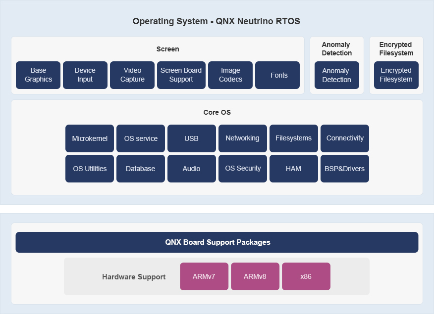- QNX Neutrino RTOS는 마이크로 커널 및 모듈식 아키텍처로 구성되며, 임베디드 장비에서 동작하는 프로그램들의 실시간 처리, 안정성, 보안 등을 지원합니다.