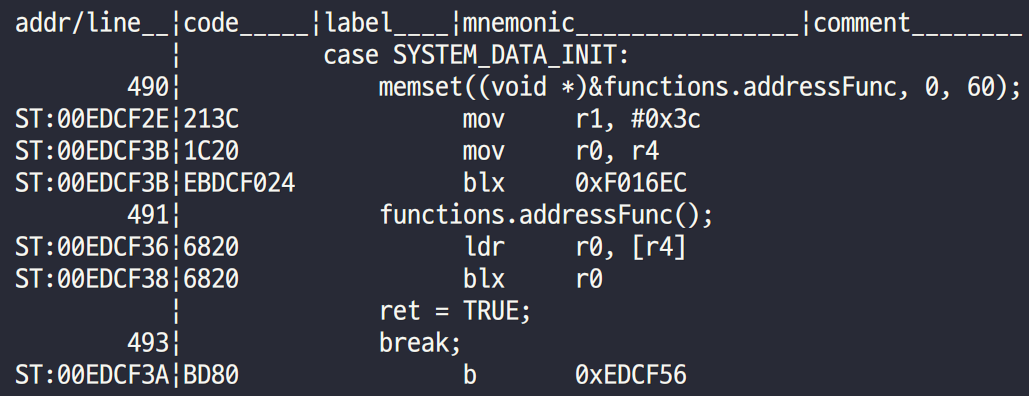 - ldmia명령어가 계속 반복되며 딱 봐도 C 코드와 일치하지 않는 mnemonic이다.