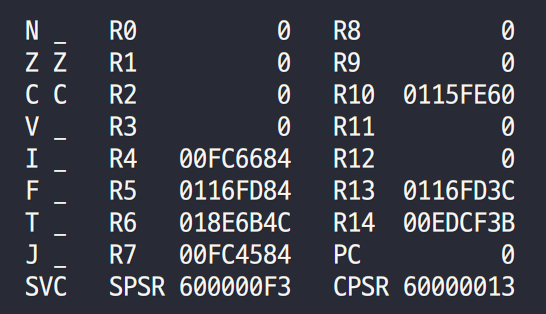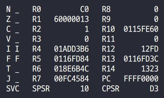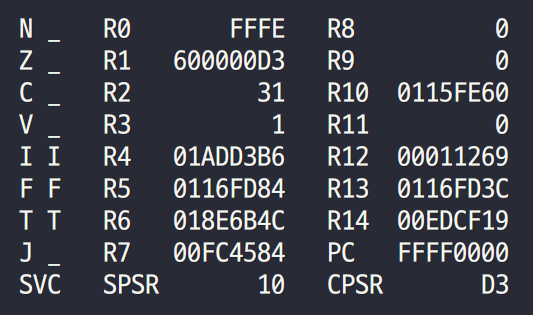 - SPSR을 보니 10011로 이전 mode가 SVC임을 알 수 있다.