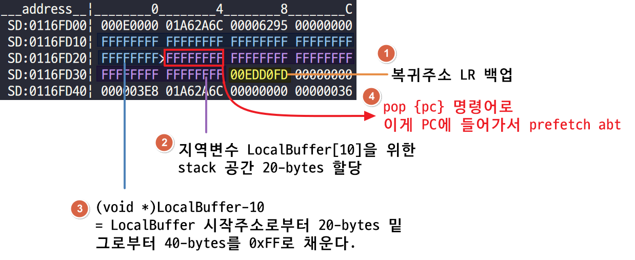 - LocalBuffer 시작주소로부터 20-bytes 밑(void * type이 2-byte 크기라고 가정하자)에서부터 40-bytes만큼을 0xFF로 초기화한다.