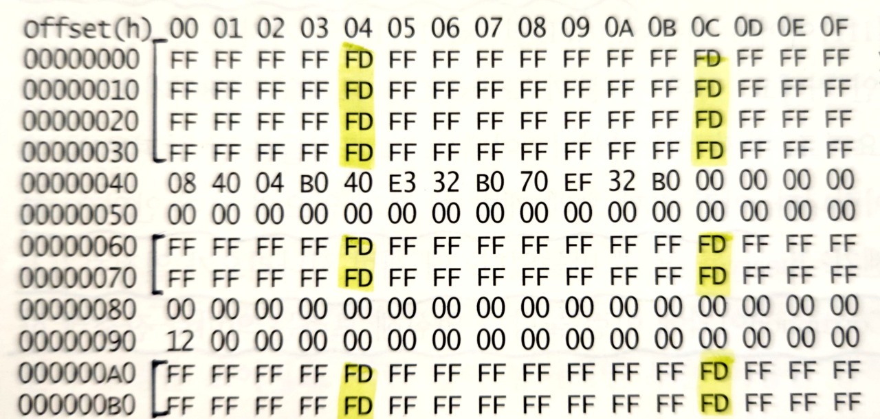 - 뭔가 규칙성이 느껴지지 않는가? 특정 열만 0xFD인 규칙성이 보인다.