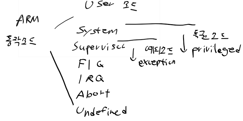 특권 모드 : 예외 처리, 시스템 자원에 접근 - system 모드, supervisor 모드, fiq 모드, irq 모드, abort 모드 등