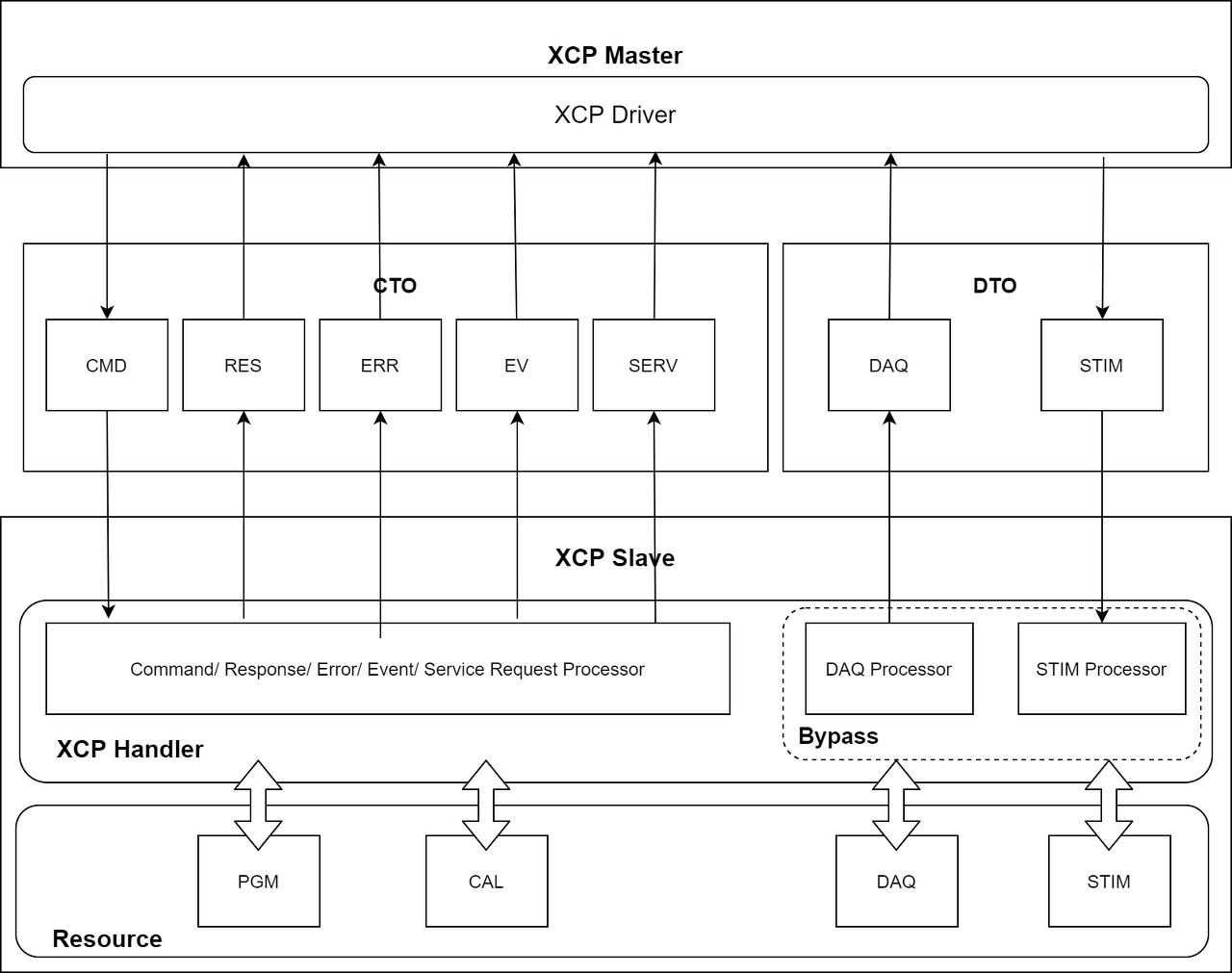 XCP 데이터는 XCP 마스터 (측정/캘리브레이션 툴/시스템) 와 XCP 슬레이브 (ECU, Runtime 환경 등) 사이에 메시지 전송 방식으로 교환된다.