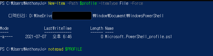 notepad $PROFILE을 엔터로 실행하면, 메모장이 뜰 것이다.