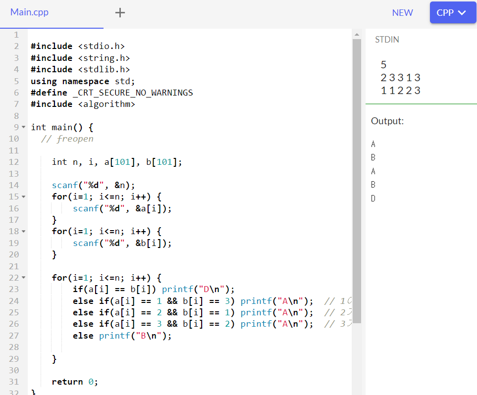 else if(a[i] == 3 && b[i] == 2) printf("A\n"); // 3가 보
