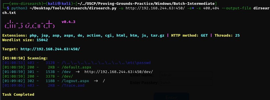 Command: python3 ~/Desktop/Tools/dirsearch/dirsearch.py -u http://192.168.244.63:450/ -e* -x 400,404 --output-file dirsearch.txt
