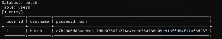 Inside this database, I found a password hash belonging to the user butch. After identifying the hash format, it appeared to be SHA-256.