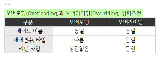 오버라이딩(Overriding) : 상위 클래스가 가지고 있는 메서드를 하위 클래스가 재정의해서 사용