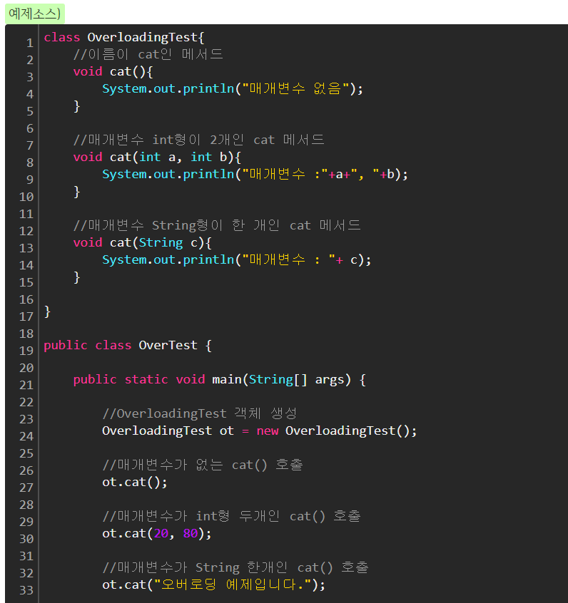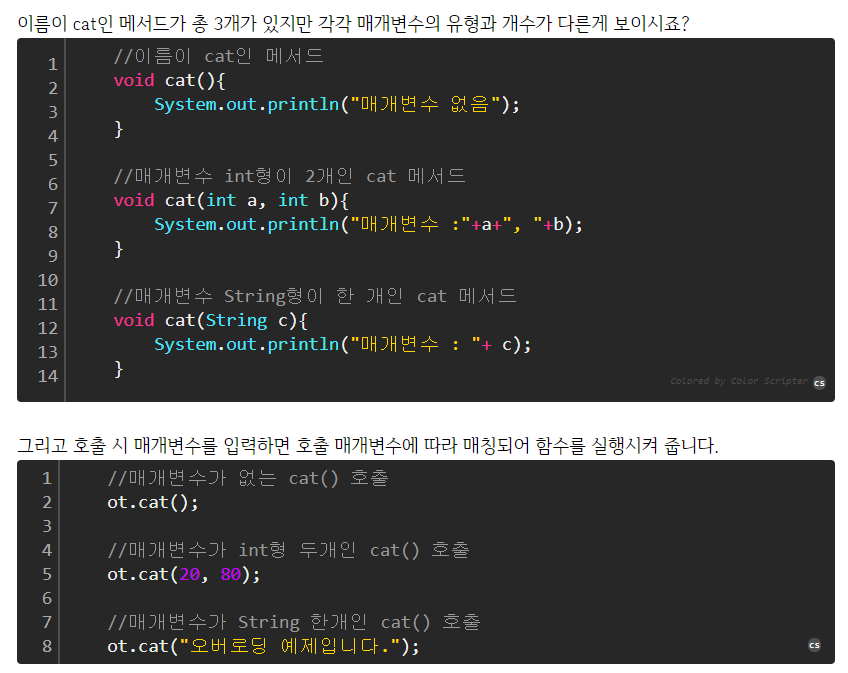 이름이 cat인 메서드가 총 3개가 있지만 각각 매개변수의 유형과 개수가 다른게 보이시죠?
