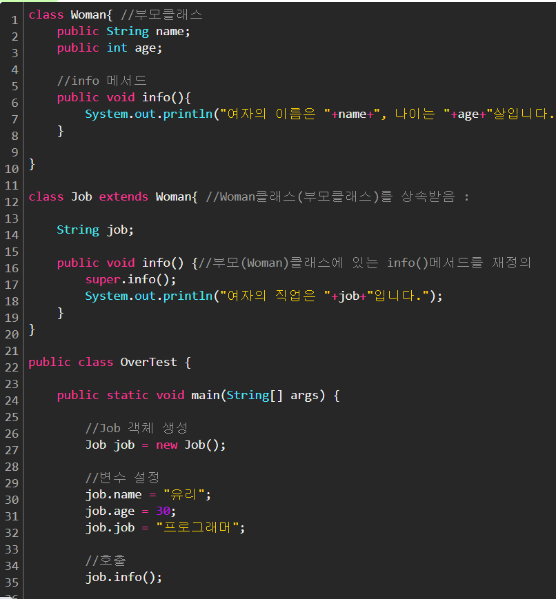 상위 클래스가 가지고 있는 멤버변수가 하위 클래스로 상속되는 것처럼 상위 클래스가 가지고 있는 메서드도 하위 클래스로 상속되어 하위 클래스에 사용할 수 있습니다. 또한, 하위 클래스에서 메서드를 재정의해서도 사용할 수 있습니다.