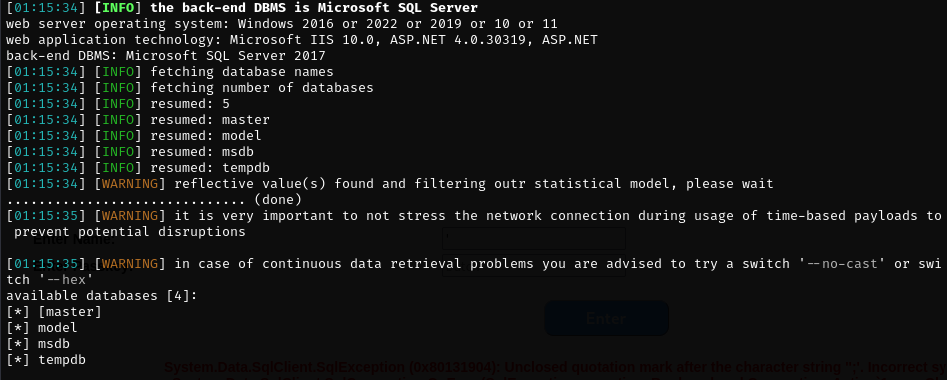 Command: sqlmap -r login.txt — dbms=mssql — dbs — technique=t — risk 3 — level 5