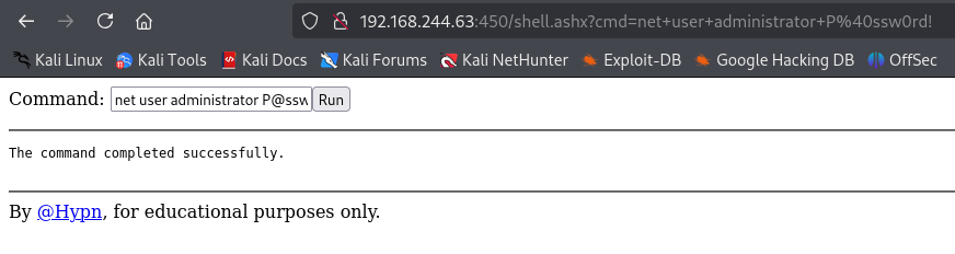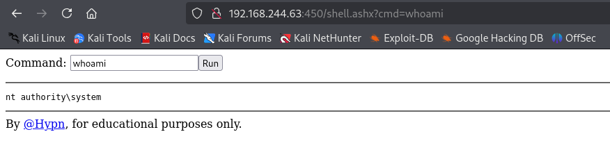 I then accessed it via: http://192.168.244.63:450/shell.ashx —and the webshell was fully functional.