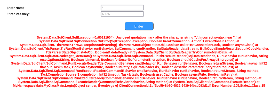 I then shifted my focus to the login feature. Since common login forms are often vulnerable to SQL Injection, I tested the input by adding a single quote (') to trigger an error. As expected, the login form returned a SQL syntax error, indicating a potential SQL Injection vulnerability.